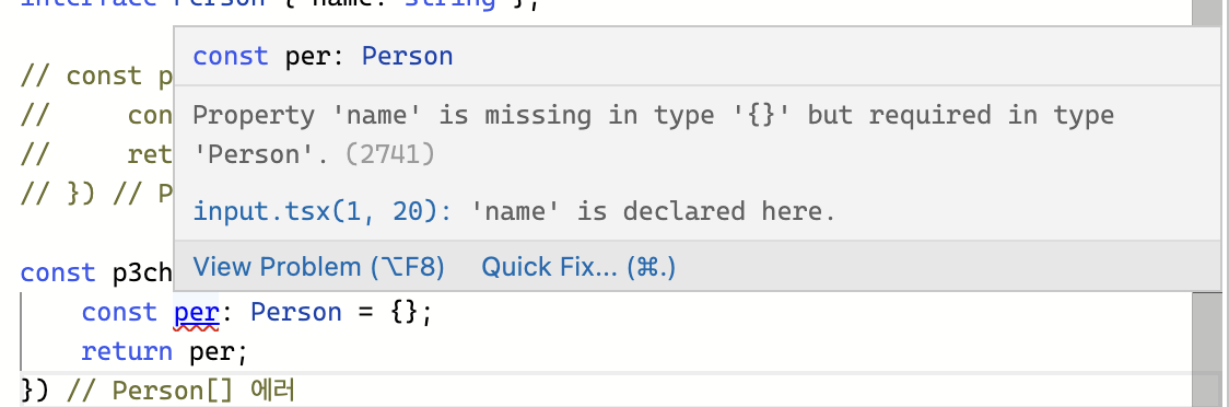 이 때 name 필드를 제외하고 {}라고 하면, ts에서 추론된 타입과 선언된 Person 이 서로 다르므로 다음과 같은 ts 에러가 발생한다.